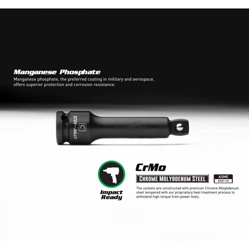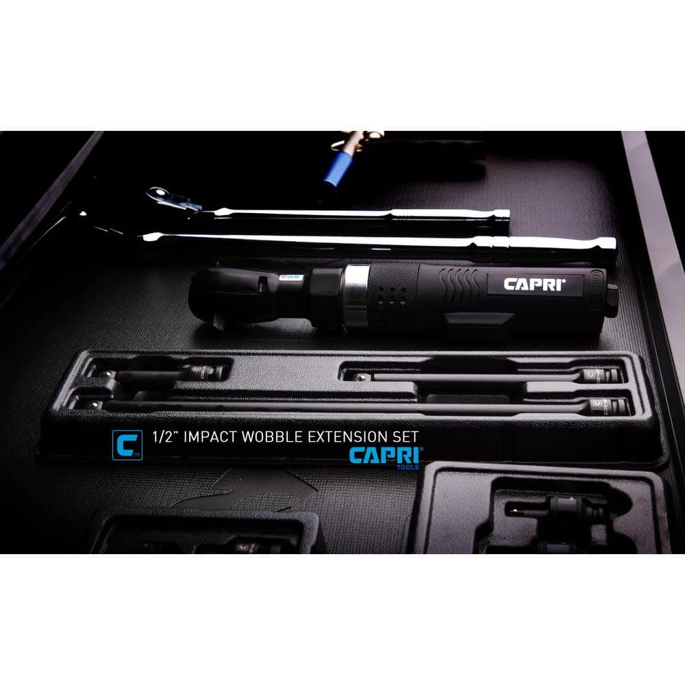 The Capri Tools 1/2 in. Drive Wobble Impact Extension Bar is 2 tools in one. It can be used as a wobble extension bar when an offset clearance is needed or as a regular rigid extension bar. The wobble feature enables you to reach and turn fasteners that are obstructed and can only be reached at an angle. It allows up to 15° offset. Spring-loaded ball detent holds sockets securely in place. When fully inserted (not at an angle), the extension bar locks into a regular rigid extension bar. These extension bars are constructed of premium Chrome Molybdenum steel tempered with our proprietary heat treatment process to withstand more torque from power tools. Expertly coated with manganese phosphate, the preferred coating in military and aerospace, which offers superior protection and corrosion resistance compared to black oxide coating on other impact tools. Three 1/2 in. drive wobble impact extension bars are included in the set: 3, 6 and 12 in. L.