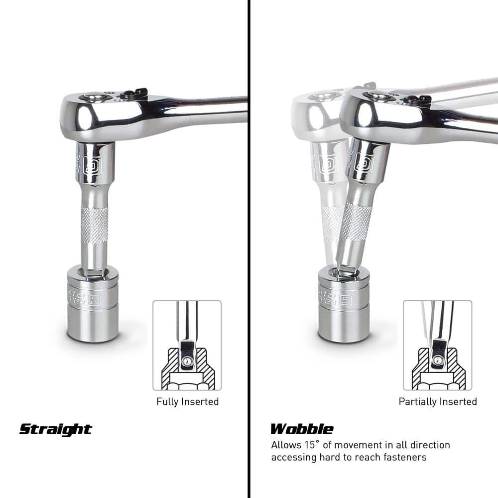 - Wobble feature lets you reach and turn fasteners that can only be reached at an angle up to 15°