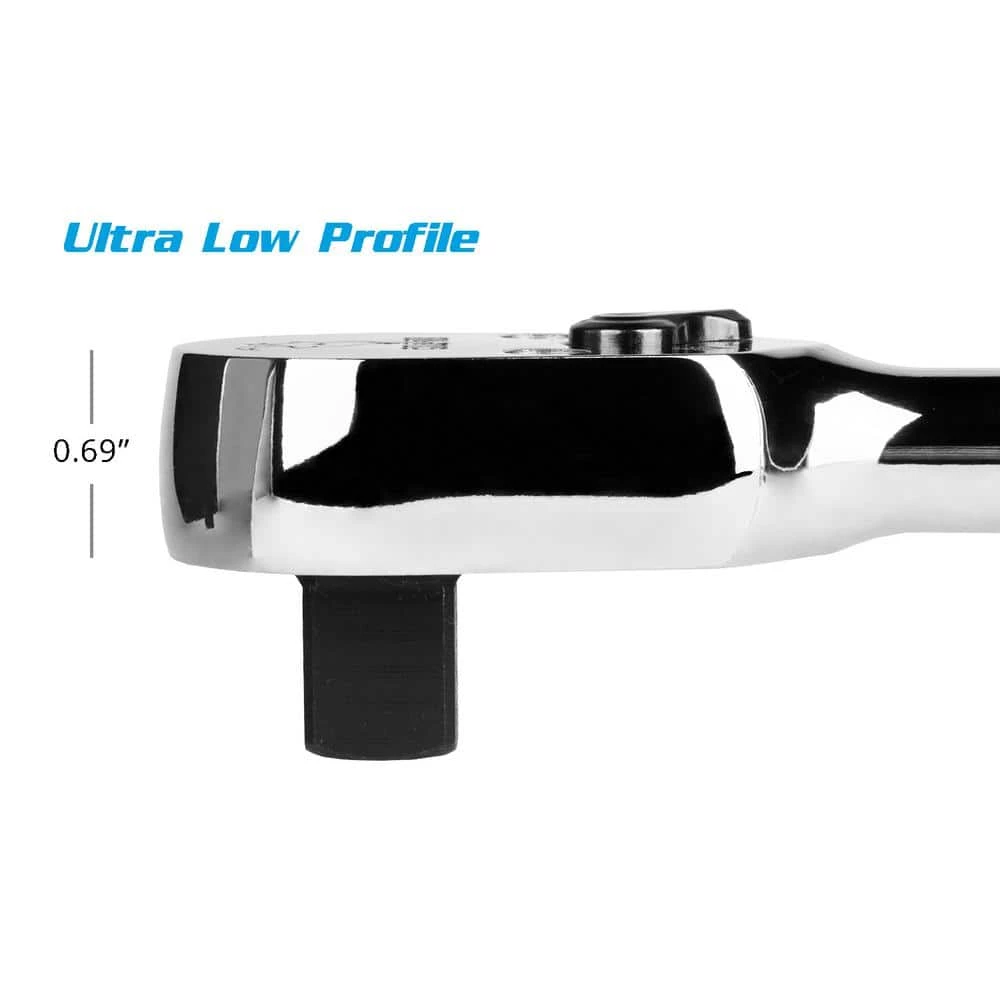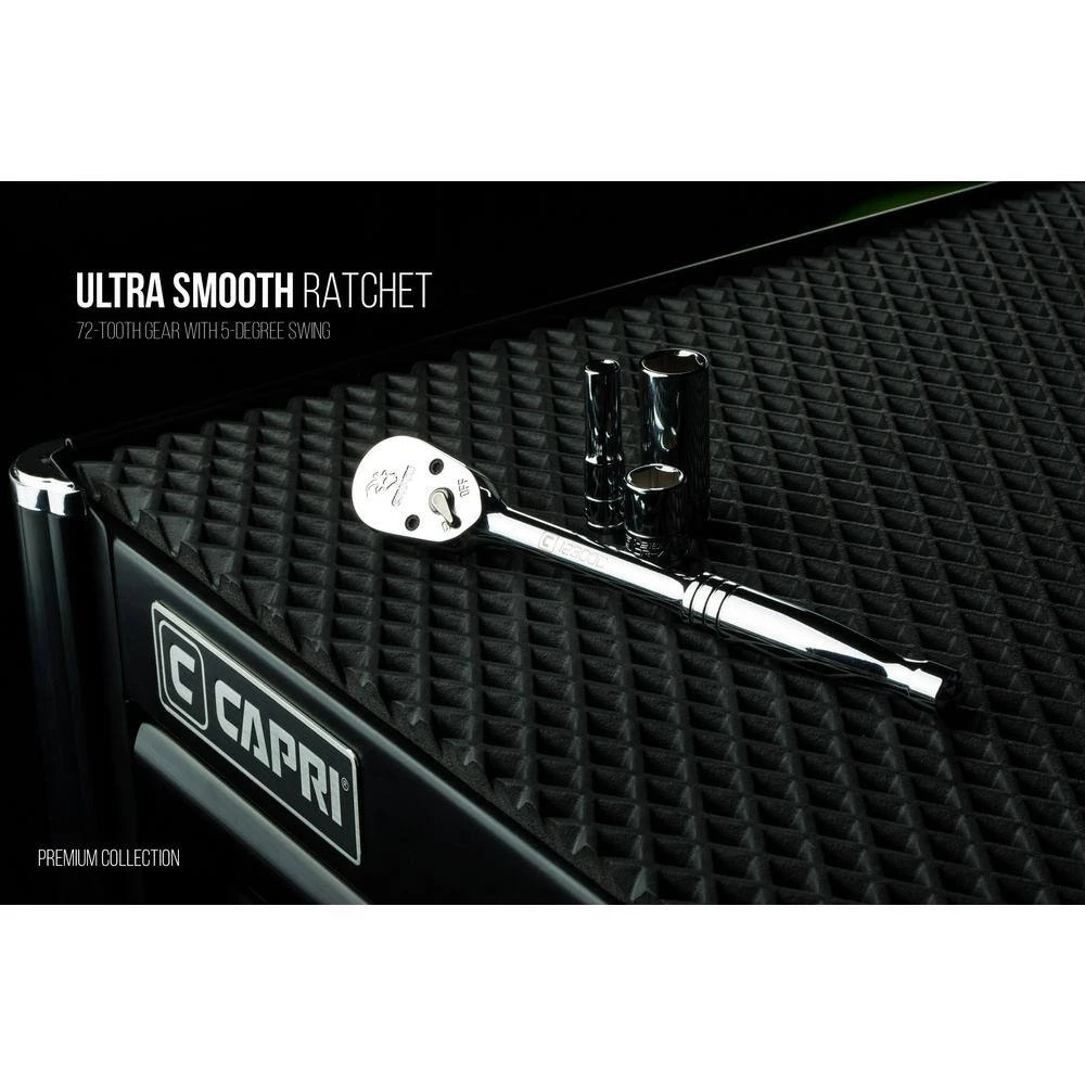 The Capri Tools Low Profile Ratchet is the go to ratchet that combines performance and versatility. It features a 72-tooth fine ratcheting gear, needing only 5° of swing arc for each turn. The small swing arc is essential for working in narrow spots but also helps you get the job done faster. With a true single-pawl gear design, the ratchet has an unparalleled ratcheting mechanism that is a joy to use. It also allows us to construct the ratchet with a low profile so you can work in more places that have a small clearance. Anti-dust design seals out dusts and debris to protect the gear and maintain internal lubrication for sustained high performance over time. The ratcheting gears works in both directions with a flush mounted lever that you can switch with just a flip of your thumb. That ratchet has our flawless chrome plating, achieved by thorough polishing and careful application of chrome protective plating, to ensure durability and corrosion resistance. This model has a 1/2 in. drive.
