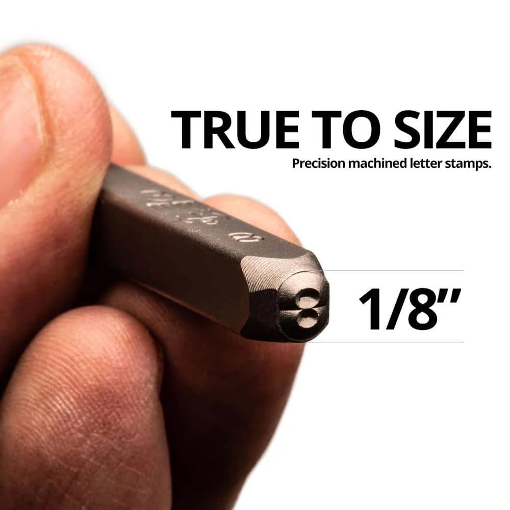 The Capri Tools Professional 1/8 in. Letter Stamp Set is made from premium components. We use premium Chrome Vanadium steel that’s been differential heat treated to achieve optimal performance and durability: 62 HRC hard stamping end produces high quality imprints and keeps the edges sharp, and 42 HRC tough hammering end excels at absorbing repeated hammer strikes and maintaining durability. Large, true-to-size, and expertly machine letters ensure the imprints are precise and refined on leather, wood, copper, brass, aluminum and mild steel. Each stamp punch has engraved sizing and identification on the side facing you, making is easy to fine the right stamp and the right orientation. This set includes 27 stamps letters A-Z in uppercase and the ampersand and Comes in a heavy-duty storage case.