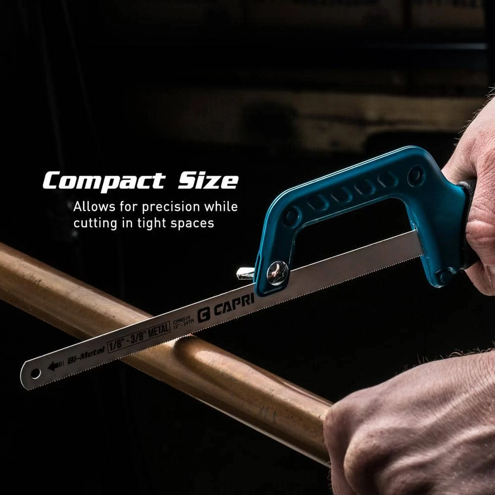 The Capri Tools 12 in. Mini Hacksaw features a compact design and is ideal for cutting in tight spaces. Patented design lets you install standard 10 or 12 in. saw blades. The mini hacksaw features an ergonomic soft handle that is easy to hold and gives you the extra torque and control you need for the job at hand. A heavy duty bi-metal 12 in. x 24 TPI saw blade is included.