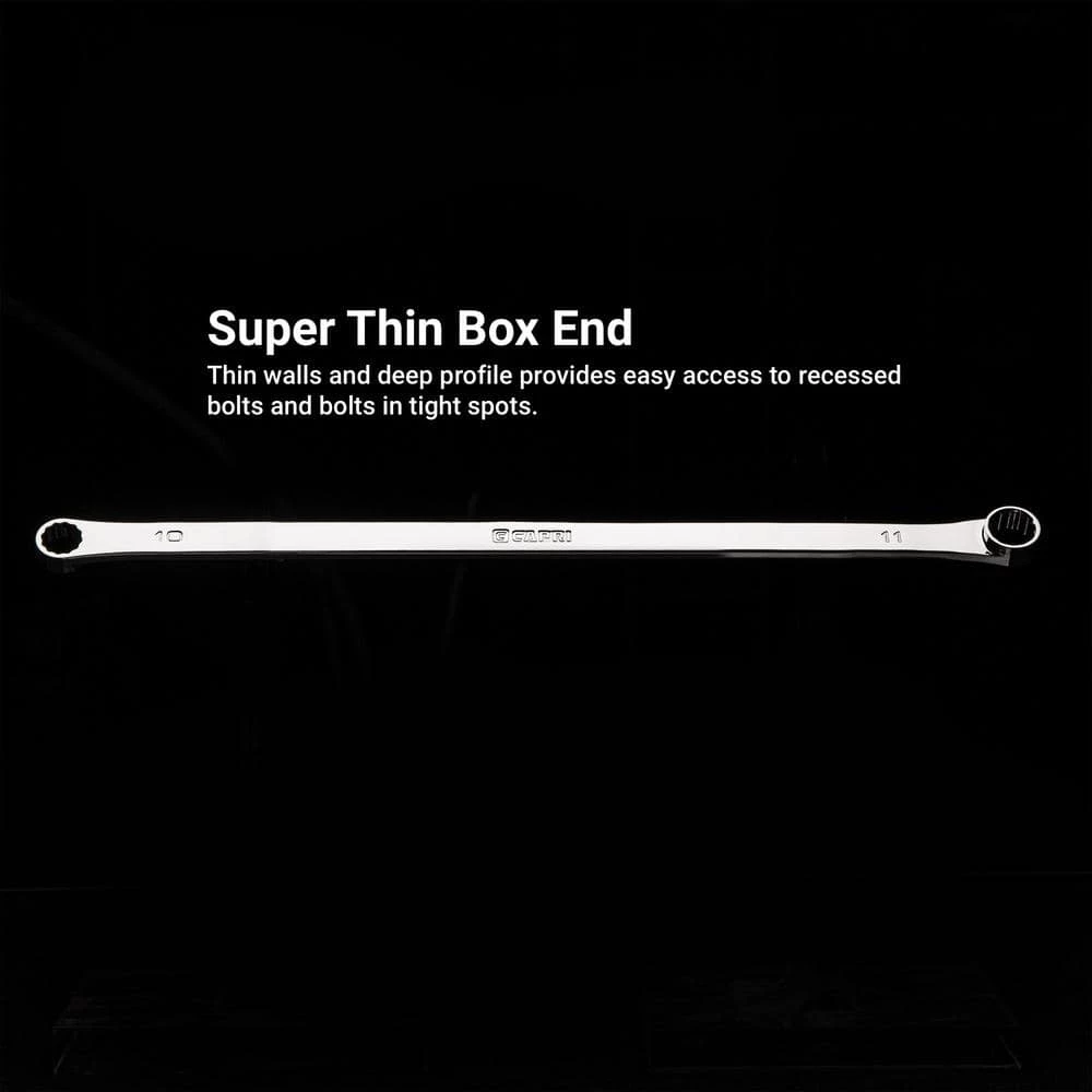 - Super thin box end with thin walls and deep profile provides easy access to recessed bolts and bolts in tight spots, 0° offset allows for a secure fit onto fasteners, giving you higher torque and easier swing, extra long handles that are up to 2x longer than standard wrenches give you the leverage you need