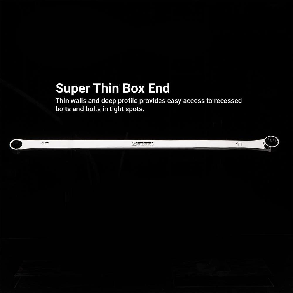 The Capri Tools 0° Offset Extra Long Box End Wrenches are designed to let you easily tackle recessed bolts and bolts in tight spots. The thin-walled super thin box end with deep profile grabs firmly onto recessed bolts. 0° offset allows for a secure fit onto fasteners, giving your higher torque and easier swing. Extra long handles, up to 2X longer than standard wrenches, give you more leverage. The wrenches are constructed with premium Chrome Molybdenum steel to provide exceptional strength and durability. These box ends have 12-point WaveDrive which transfers torque uniformly and prevents damaging and rounding of the bolt. Finished with our flawless chrome plating, achieved by thorough polishing and careful application of chrome protective plating, it ensures durability and corrosion resistance. Large stamped sizing won’t fade over time.