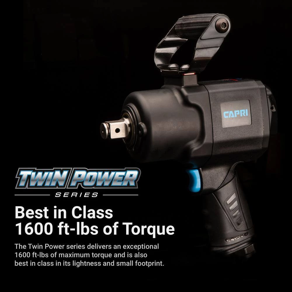 The Capri Tools Twin Power Series Air Impact Wrench exerts industry leading 1600 ft. lbs. of maximum torque. it is also light and with a small footprint at just 9.9 lbs. and 8.4 in. L. The Twin Power series is equipped with patented dual cylinder air motor; it deploys air more efficiently while generating more torque. all in a smaller form factor. It is enclosed in a light and impact resistant composite body. It operates with low vibration at only 10.7 m/s2 and helps reduce fatigue over long periods of use. 1 hand operation with a large forward/reverse thumb dial. Top support handle enhances handling and maneuverability. It operates quietly at 90 dBA with low air consumption at only 7.9 CFM at 90 psi. Comes with 3/8 in. NPT air inlet. Includes a removable hanger for quick tool stowage.