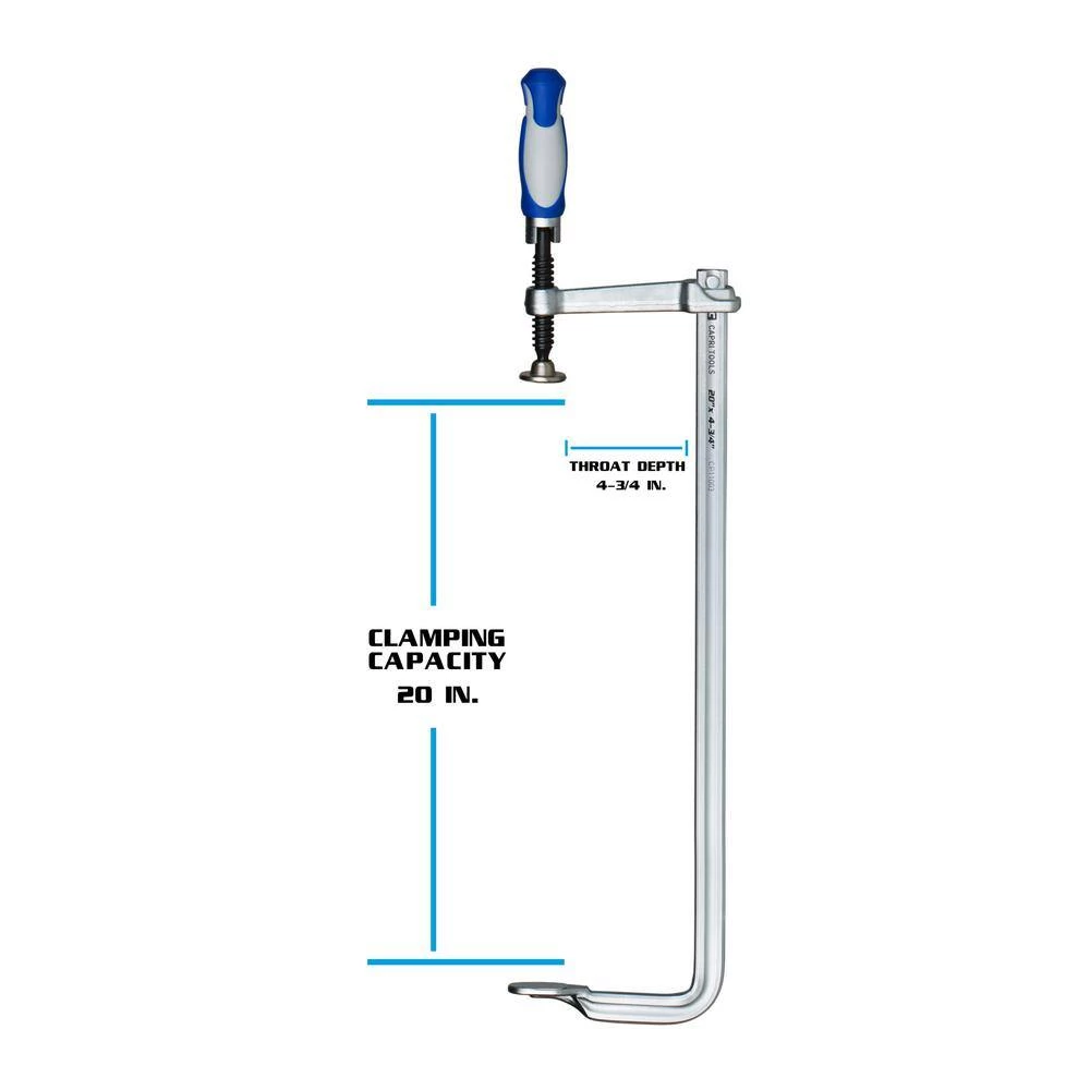 The Capri Tools 20 in. All Steel Bar Clamp is constructed with premium all steel jaws, rail, and spindle. Each steel component is expertly forged and heat treated. This f style bar clamp is engineered to perform and is made to last. The steel surfaces are thoroughly nickel and chrome plated for corrosion resistance. It is equipped with a foldable ergonomic handle which lets you clamp and unclamp your work pieces quickly and easily. Fold the handle into a T bar for extra leverage as well as better grip in tight spots. Precisely machined spindle ensures smooth operation. Heavy duty swivel pad applies even pressure to work pieces of different shapes. This Capri Tools Bar Clamp has a 20 in. clamping capacity, 4-3/4 in. throat depth, and 1,653 lbs. of clamping force.