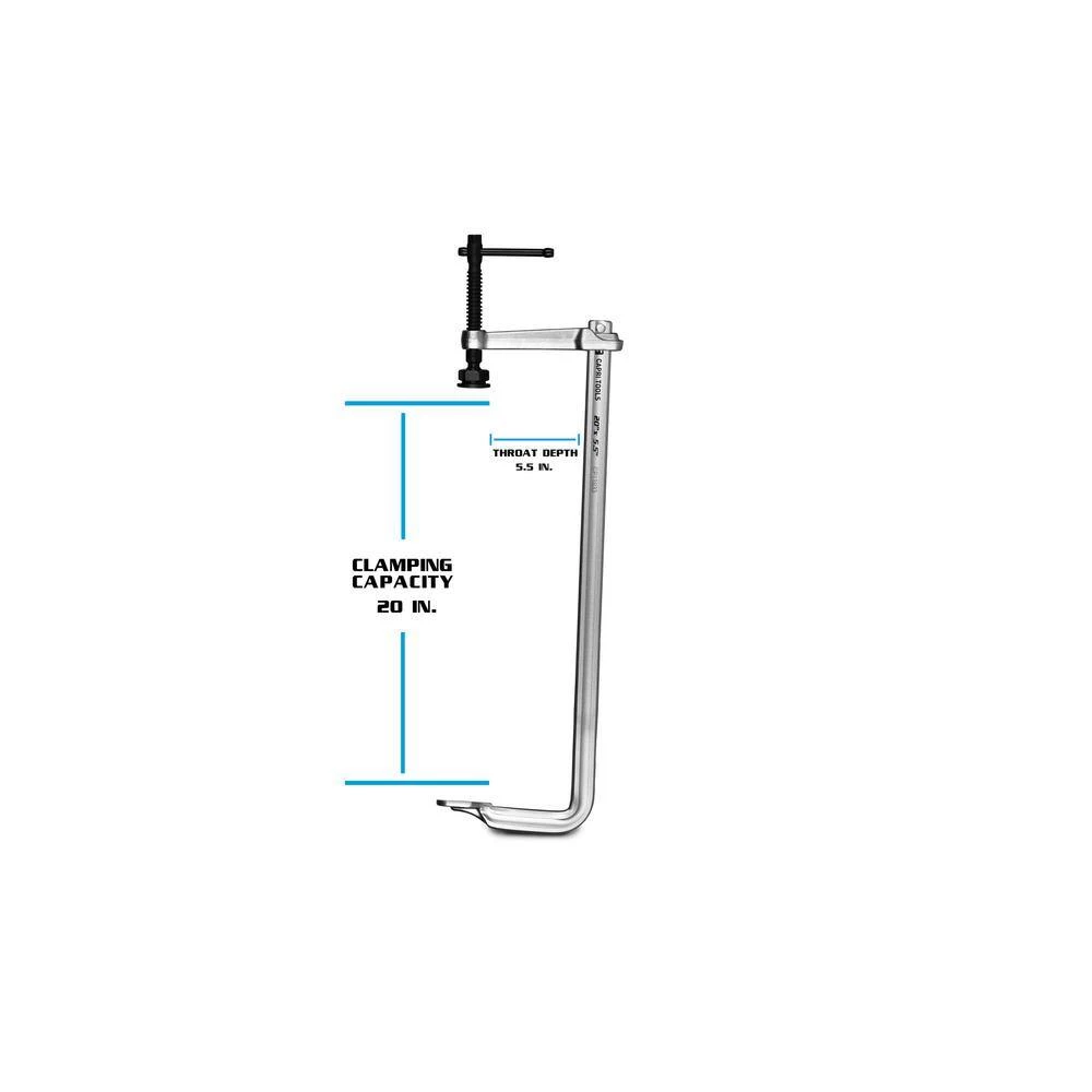 The Capri Tools 20 in. Heavy Duty All Steel Bar Clamp is engineered and constructed for heavy duty applications. The f style bar clamp is entirely made with premium steel. Each component – jaws, rail, spindle, and handle – is expertly forged and heat treated. It is engineered to perform and made to last. The steel surfaces are thoroughly nickel and chrome plated for corrosion resistance. It is equipped with hardened steel T bar handle, letting you apply and release clamping pressure easily and surely. Precisely machined spindle ensures smooth operation. The spindle also features a 5/8 in. hex end which lets you use a wrench or ratchet wrench for fast tightening and untightening. Heavy duty swivel pad applies even pressure to work pieces of different shapes. This Capri Tools Bar Clamp has a 20 in. clamping capacity, 5-1/2 in. throat depth, and 2,645 lbs. of clamping force.