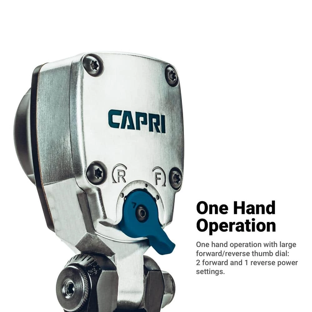 The Capri Tools Flex-Head Angle Series Angle Impact Wrench is a must have for tackling fasteners in hard-to-reach areas. It has a 120° flexible head which is tiltable up to 60° forward and up to 60° backward. letting you easily reach those hidden bolts. 360° rotatable trigger lets you operate the tool in the best position possible. It has an ultra-compact form factor, just 3.25 in. D and 2.51 in. W. The 10.9 in. extended length gives you the extra reach you need. It packs a 220 ft./lbs. of maximum reverse torque and 185 ft.-lbs. of forward torque, twice powerful than other air angle impact wrenches. 1-hand operation with large forward/reverse thumb dial (2 forward and 1 reverse). It has a soft grip ergonomic handle for a sure and comfortable grip. It operates quietly at 91.2 dBA and with low air consumption at only 2.96 CFM at 90 psi. Weighs only 2.75 lbs. Comes with 1/4 in. NPT air inlet.