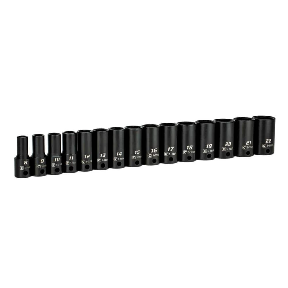 - 15-piece set 3/8 in. drive semi-deep impact sockets: 8, 9, 10, 11, 12, 13, 14, 15, 16, 17, 18, 19, 20, 21, 22 mm