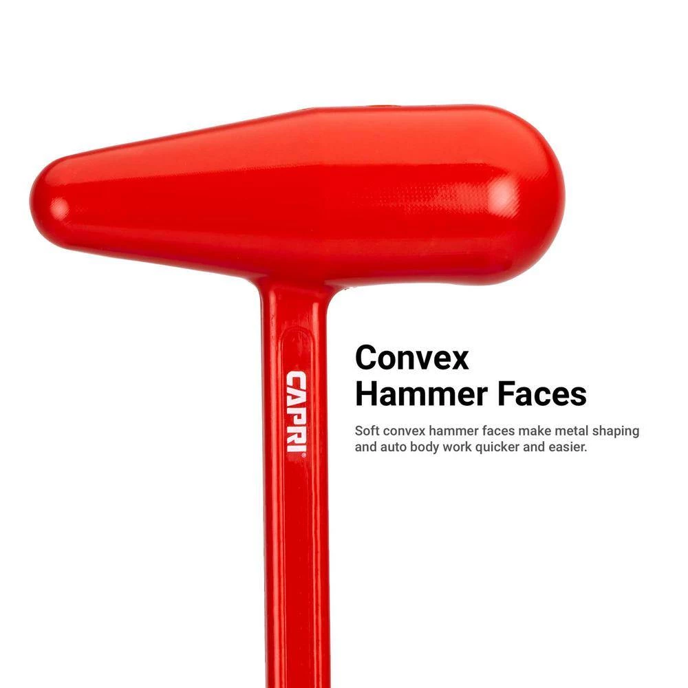 The Capri Tools Dead Blow Bossing Mallet Block Hammer makes metal shaping and fabrication work faster and easier. The shot-filled dead blow action reduces rebound while providing maximum striking force. It provides the force you need while saving your arm and wrist from strain. Non-marring and non-sparking advanced polyurethane is cast over heavy-duty welded steel core and canister. Convex hammer faces are designed for metal shaping and auto body work.
