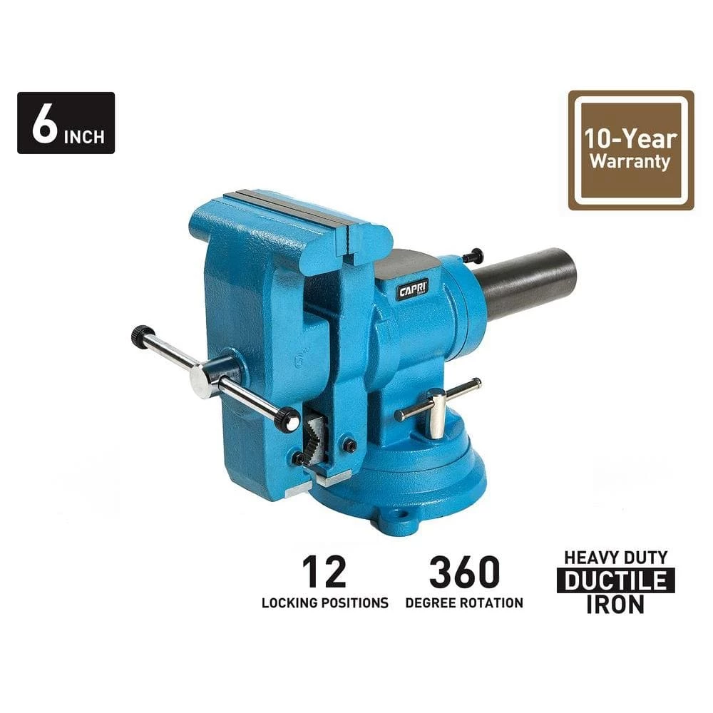 Use this bench vise for all kinds of woodwork, pipe work, metalwork, sawing, drilling and gluing things together. Boasting 9,000 lbs. of clamping force, this bench vise is designed for more diverse work with its base and head that rotate 360° for extra customizability. The head can be locked in at 12 set points, each within 30° and the base is easy to place and lock the jaws wherever needed. The heavy-duty ductile iron (60,000 psi) is remarkably strong and can execute mid-level applications flawlessly.