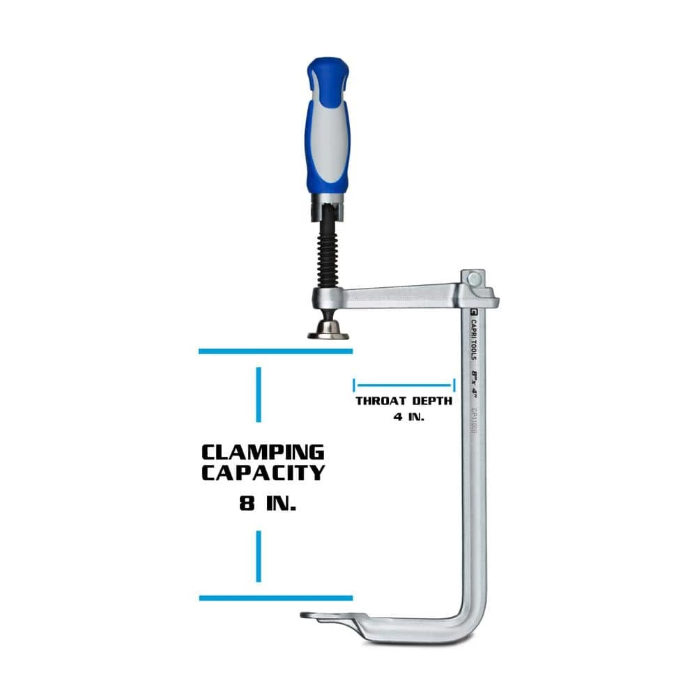 The Capri Tools 8 in. All Steel Bar Clamp is constructed with premium all steel jaws, rail, and spindle. Each steel component is expertly forged and heat treated. This f style bar clamp is engineered to perform and is made to last. The steel surfaces are thoroughly nickel and chrome plated for corrosion resistance. It is equipped with a foldable ergonomic handle which lets you clamp and unclamp your work pieces quickly and easily. Fold the handle into a T bar for extra leverage as well as better grip in tight spots. Precisely machined spindle ensures smooth operation. Heavy duty swivel pad applies even pressure to work pieces of different shapes. This Capri Tools Bar Clamp has an 8 in. clamping capacity, 4 in. throat depth, and 922 lbs. of clamping force.