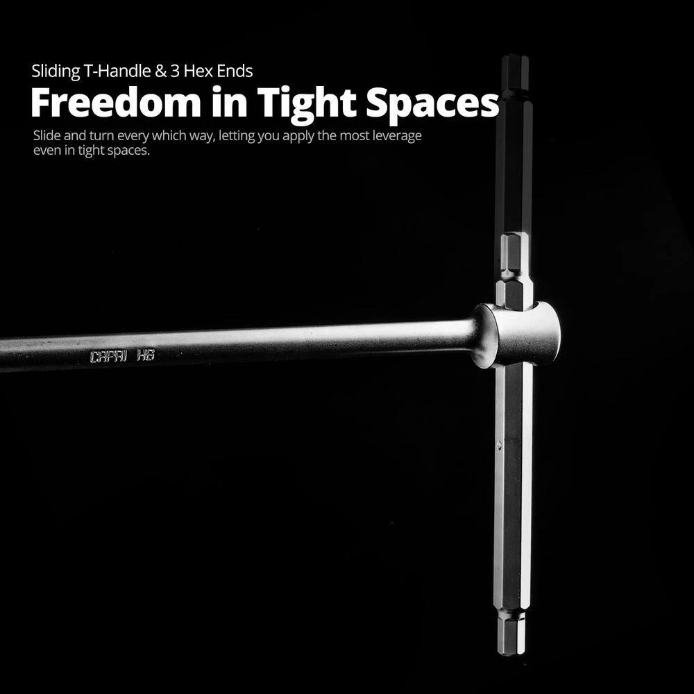 The Capri Tools Sliding T-Handle Hex Key Wrench is built to satisfy even the most demanding professionals. It has a sliding top bar and 3 hex ends, letting you maneuver easily in tight spaces and adapt quickly to apply the most torque possible. Premium Chrome Vanadium steel cross bars, each forged from a single piece steel, are built to last and perform in high torque situations. Precision machined hex end with chamfered edges fits smoothly onto fasteners and prevents rounding. There are 3 detent balls to keep the sliding handle secure. The center spring-loaded detent ball clicks the handle in place at the center T position. 2 end detent balls keep the handle secure at L positions. We completed the t-handle wrench with our premium Satin chrome finish, our most sophisticated finishing and coating profess. Satin chrome not only enhance durability, but give the t-handle an unparalleled look and feel. All 3 hex ends are sized 8 mm.