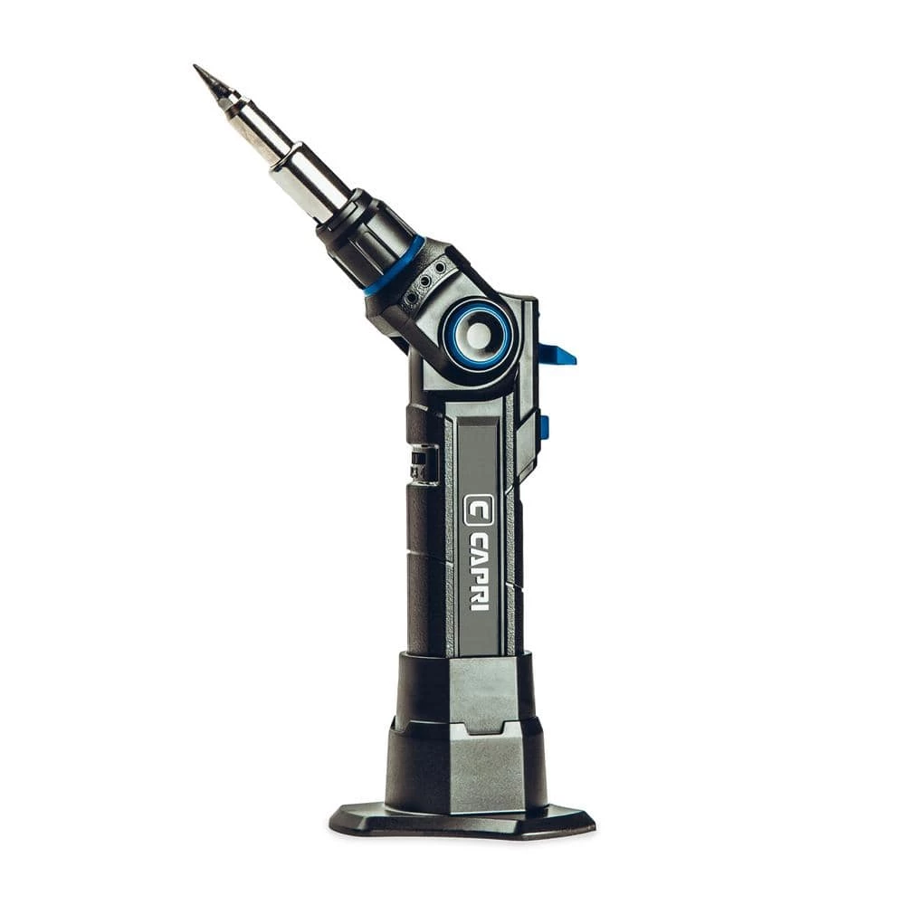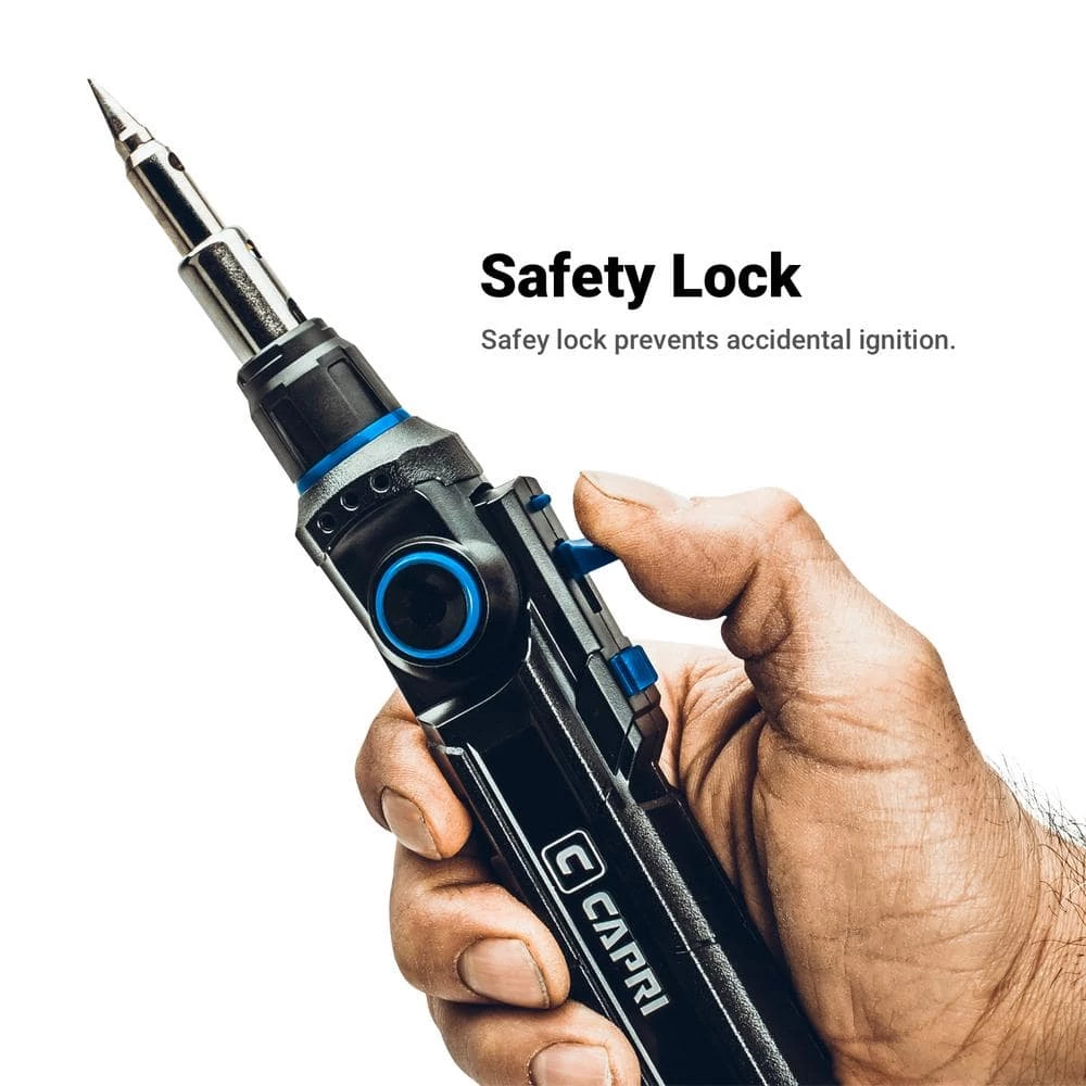 The Capri Tools Multi-Angle Butane Soldering Iron Kit lets you take care of soldering, cutting shaping, and more with a single tool. The kit includes 6 easy-to-change interchangeable tips for soldering and cutting (soldering tip, sharp knife, anvil tip, chisel tip, needle tip, hot knife), and 1 deflector attachment for shaping. The tool transforms into a hot blower or a micro butane torch for a wide variety of heating, shaping, and material removing applications. Features multi-angle positions at 5°, 45°, and 90° adjustable with a simple press of a button, 4 flame settings to adjust its length and intensity, safety ignition lock, and a magnetic handsfree base stand. A transparent fuel windows lets you see when the fuel tank is full and when it’s almost time for a refill. Fill the tank with butane gas designed for lighters and torches (butane gas not included). Set completes with a Mechanic’s Tray for easy organization and storage.