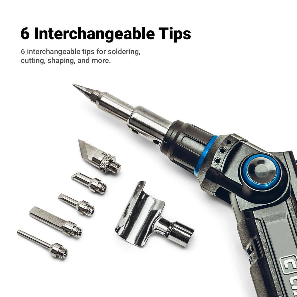 - Multi-angle, multi-function butane soldering iron with interchangeable tips lets you take care of soldering, cutting, shaping, and more with a single tool