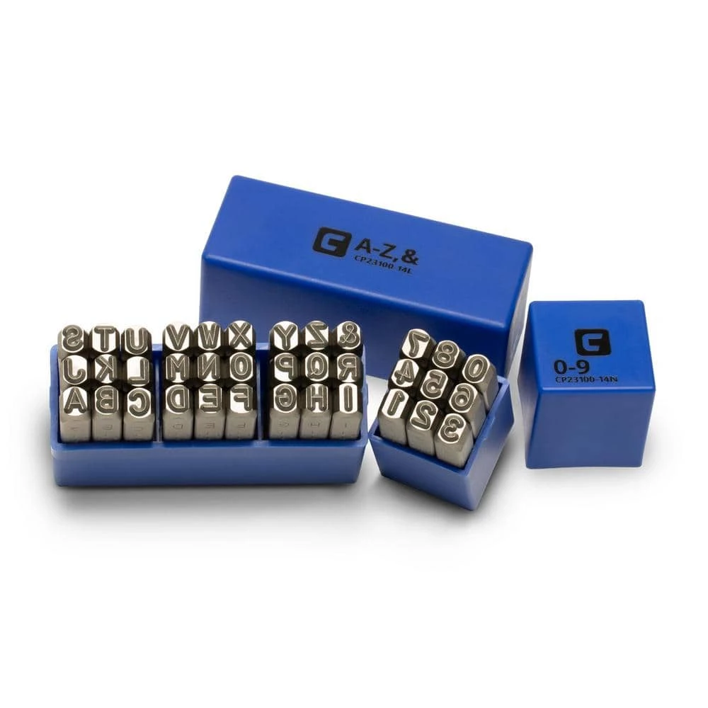 The Capri Tools Professional 1/4 in. Letter and Number Stamp Set is made from premium components. We use premium Chrome Vanadium steel that’s been differential heat treated to achieve optimal performance and durability: 62 HRC hard stamping end produces high quality imprints and keeps the edges sharp, and 42 HRC tough hammering end excels at absorbing repeated hammer strikes and maintaining durability. Large, true-to-size, and expertly machine letters/numbers ensure the imprints are precise and refined on leather, wood, copper, brass, aluminum and mild steel. Each stamp punch has engraved sizing and identification on the side facing you, making is easy to fine the right stamp and the right orientation. Includes 36 stamps: letters A-Z in uppercase, the ampers, and numbers 0 to 9. Comes in heavy-duty storage cases.