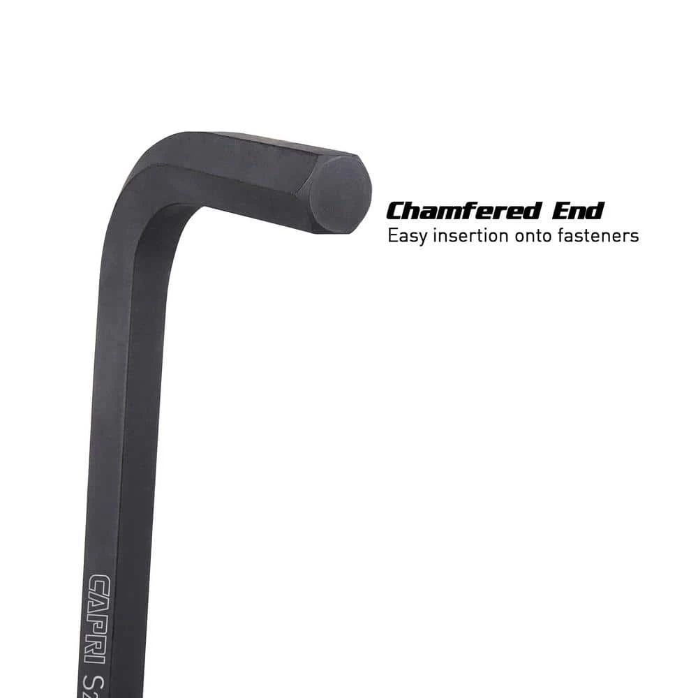 The Capri Tools Hex Key Wrench Set is constructed of premium S2 steel, a steel used only for premium hand tools for its shock-resistant and tough properties, outperforming Chrome Vanadium and lesser alloy steels, and therefore our hex key wrenches maintain their shape with heavy use. Each hex key wrench features a hex end and a ballpoint end. Hex end features chamfered edges for easy insertion onto fasteners. Ballpoint end can enter a fastener at up to a 25° angle, reaching hard-to-reach areas. Our flexible single piece storage case opens flat so you can easily access your wrenches, and it folds and latches securely for easy carry and storage. The wrenches are finished with corrosion resistant smooth black oxide.