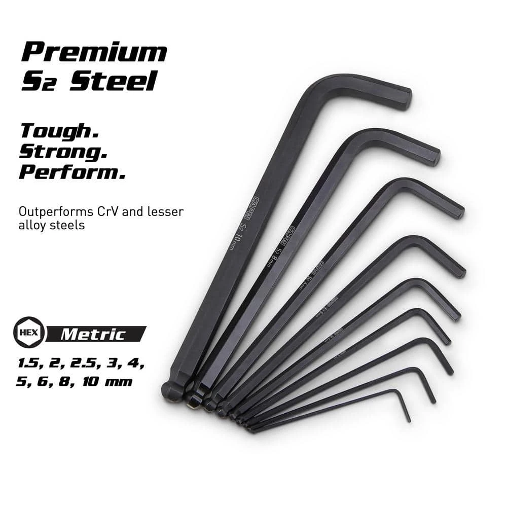 The Capri Tools Hex Key Wrench Set is constructed of premium S2 steel, a steel used only for premium hand tools for its shock-resistant and tough properties, outperforming Chrome Vanadium and lesser alloy steels, and therefore our hex key wrenches maintain their shape with heavy use. Each hex key wrench features a hex end and a ballpoint end. Hex end features chamfered edges for easy insertion onto fasteners. Ballpoint end can enter a fastener at up to a 25° angle, reaching hard-to-reach areas. Our flexible single piece storage case opens flat so you can easily access your wrenches, and it folds and latches securely for easy carry and storage. The wrenches are finished with corrosion resistant smooth black oxide.