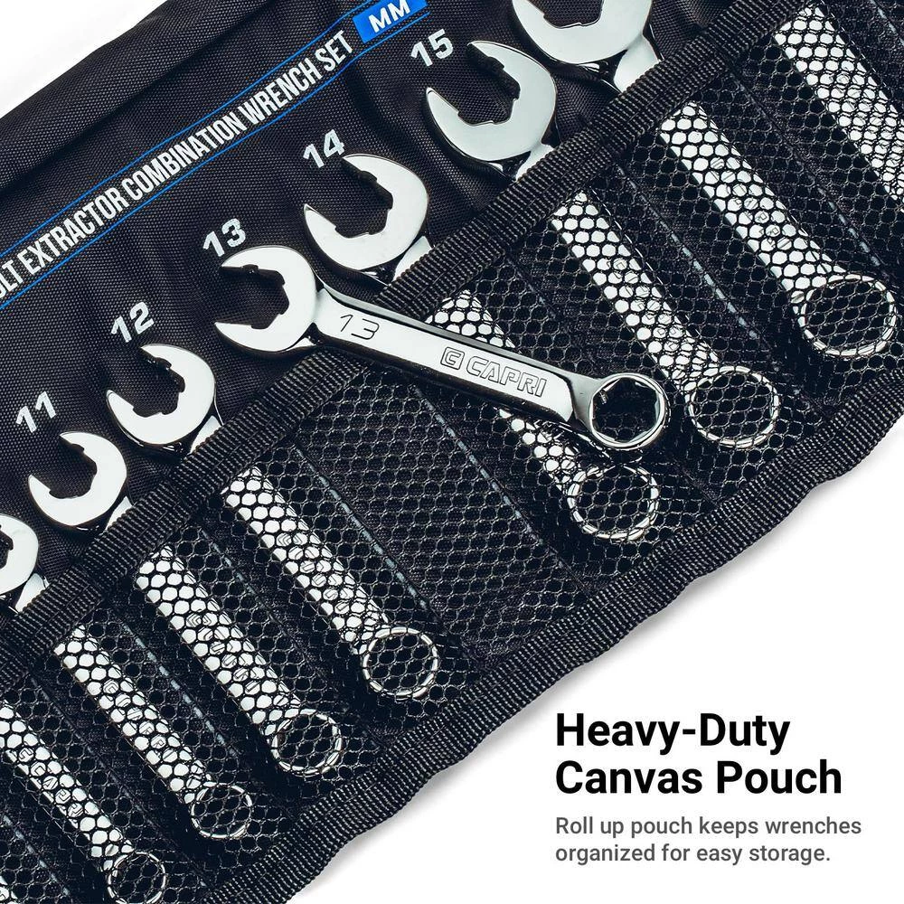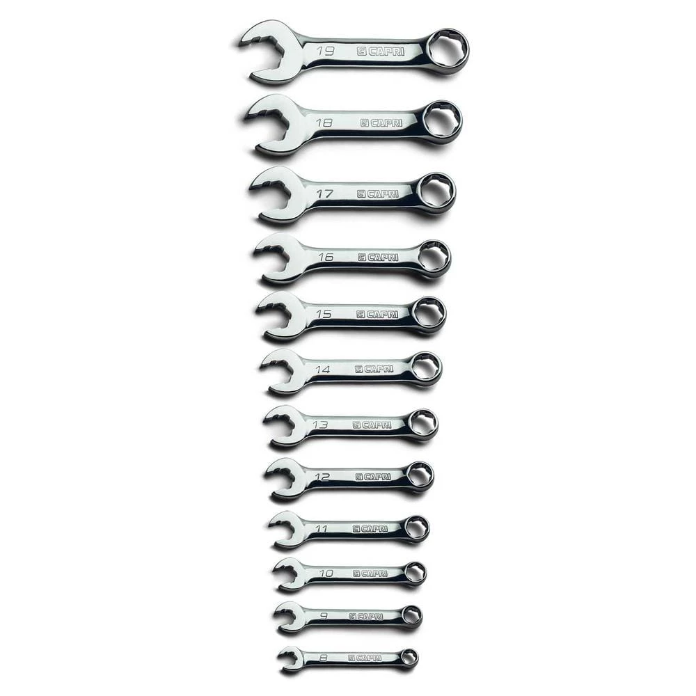 The Capri Tools WaveDrive Pro Combination Wrenches are a new generation of combination wrenches that lets you tackle bolts in virtually any condition. They feature WaveDrive Pro with a specialized geometry that gives you a powerful grip on bolts, even works as a bolt extractor on bolts that are up to 90% rounded off. WaveDrive Pro open end (3-point) and box end (6-point) give you a sure grip and satisfying turns on both unrounded and rounded bolts. WaveDrive Pro also prevents damaging and rounding of unrounded bolts. The stubby length handle lets you access hard-to-reach areas where clearance is limited. The box end is offset 15° for knuckle clearance and working in tight spots. Made with premium Chrome Vanadium steel and each wrench is impeccably polished and finished with careful application of our MaxChrome protective plating, ensuring durability and corrosion resistance.